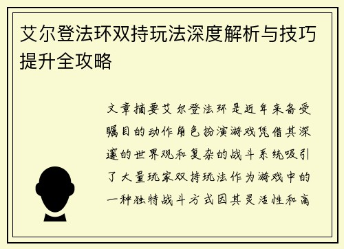 艾尔登法环双持玩法深度解析与技巧提升全攻略
